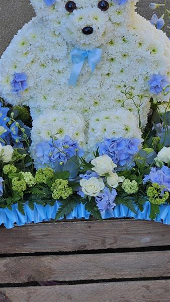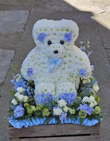 A heartfelt and unique floral tribute, lovingly crafted into the shape of a sitting teddy bear. This 3D design is created using fresh white chrysanthemums, accented with soft blue blooms and a delicate ribbon bow for a charming finish. Resting on a lush base of roses, hydrangea, viburnum and seasonal foliage, this piece is both striking and sentimental – a beautiful way to honour the memory of a loved one.