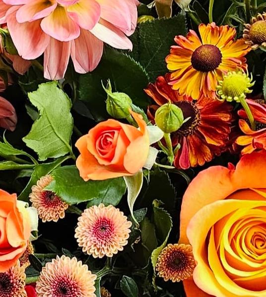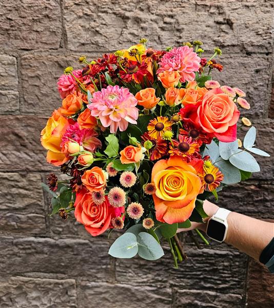 A bold and vibrant hand-tied bouquet bursting with autumn warmth. Featuring glowing orange and coral roses, pink dahlias, spray roses, and seasonal chrysanthemum, this bouquet captures the beauty of the season in every petal.