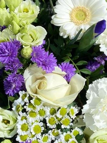 Nestled among the blooms is statice, with its clusters of tiny purple flowers creating a serene backdrop for the focal blooms. Symbolizing remembrance and everlasting love, statice adds a sense of depth and meaning to the arrangement, honoring cherished memories with grace and reverence.