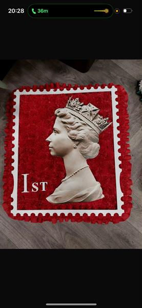 The Queen’s 1st Class Stamp Tribute is a bold and elegant design created in honour of Her late Majesty. Made with a rich red floral base and finished with a precision-cut silhouette of Queen Elizabeth II, this tribute captures royal dignity and respect. The decorative scalloped stamp edges complete the classic look.
