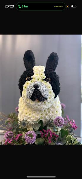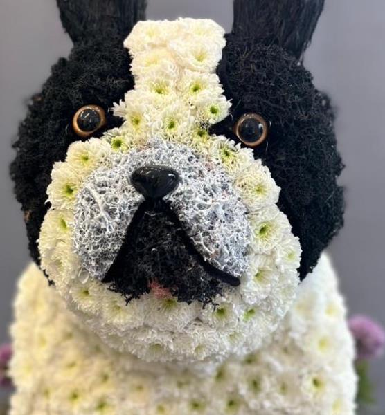 This French Bulldog Floral Tribute is a stunning 3D handcrafted design created using premium white and black chrysanthemums, textured materials, and lifelike detailing to capture the dog’s character and expression. Set on a natural meadow-style base with thistles, waxflower and lush foliage, this tribute is a heartwarming way to honour someone who adored their dog.