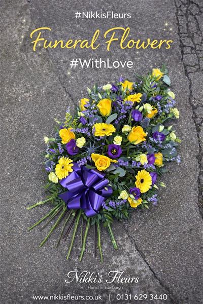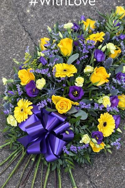 Our Yellow & Purple Funeral Sheaf is a beautiful and meaningful tribute, thoughtfully designed to honour and celebrate a life loved and remembered.