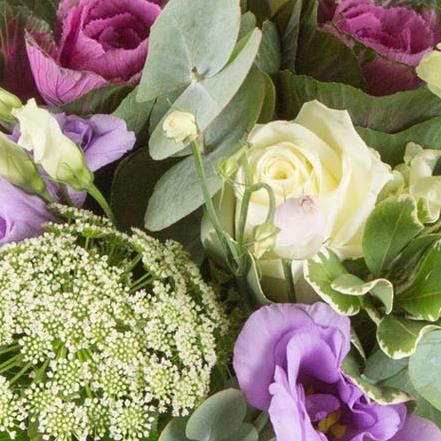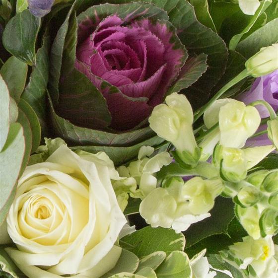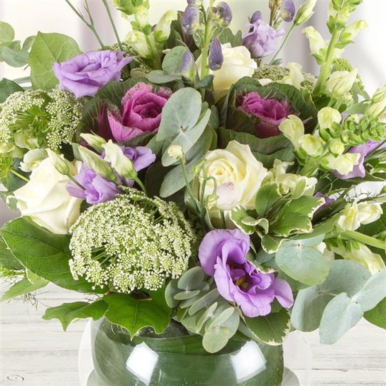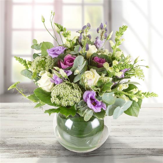 This exquisite hand-tied arrangement is a fusion of serene whites and enchanting lilacs, featuring the delicate beauty of roses and the captivating allure of aconitum. The result is a captivating symphony of colors and textures, thoughtfully presented in a delightful glass vase or bowl, depending on availability.