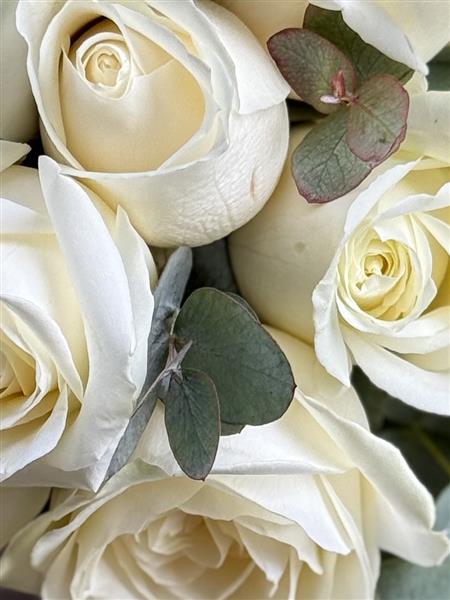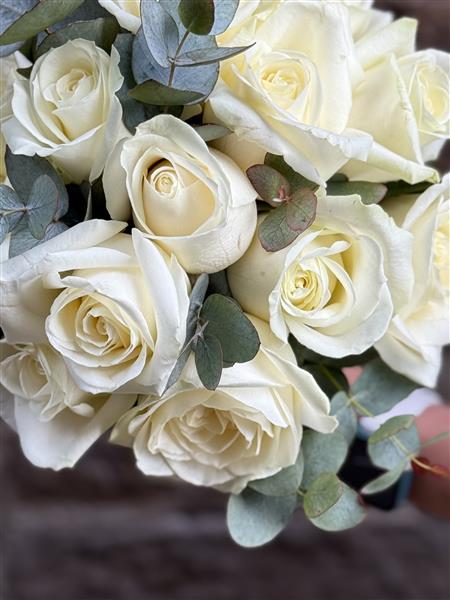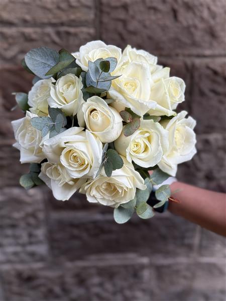 Our classic Heyday bouquet featuring 15 stunning ivory roses, elegantly paired with soft eucalyptus for that natural, romantic touch.