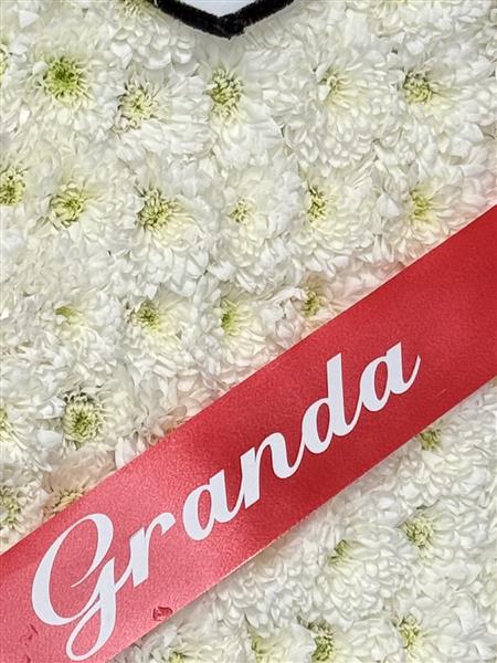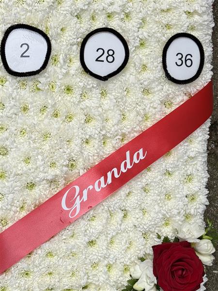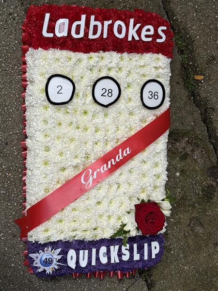 This one-of-a-kind floral tribute is designed to resemble a Ladbrokes betting slip, lovingly crafted to celebrate the life of a cherished Granda with a personal touch. Featuring a vibrant red and purple colour scheme, the tribute is built from fresh chrysanthemums and highlighted with three lucky numbers. A red ribbon sash bearing the word Granda adds a sentimental finishing touch, along with elegant fresh roses and freesias for a refined floral accent.