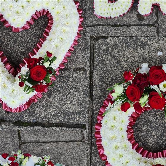 - **Open Heart**: A beautiful open heart arrangement made with a blend of maroon and white flowers, symbolizing enduring love and heartfelt remembrance.
