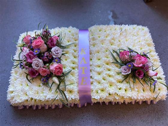 Traditionally designed using fresh flowers and foliage, Bible tributes are often finished with a central ribbon and complementary floral clusters. Colour palettes and flower choices can be kept classic and understated or personalised to reflect individual preferences.