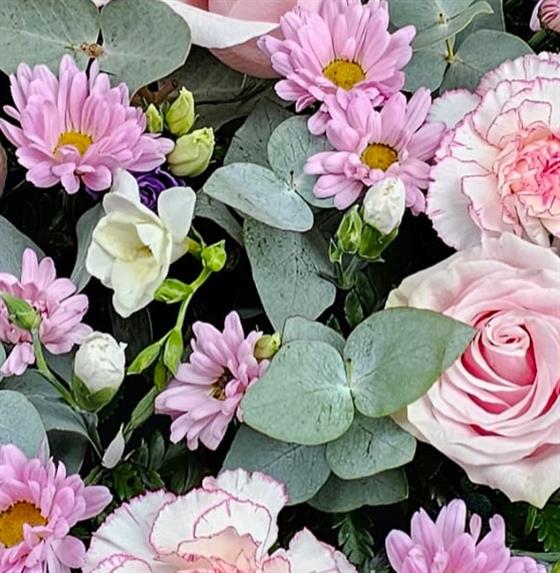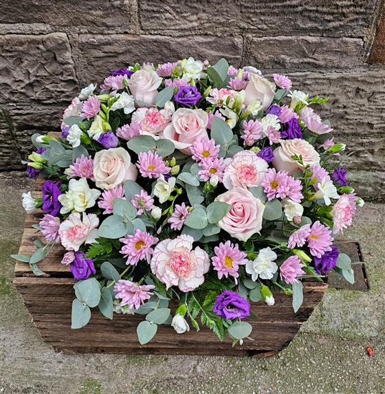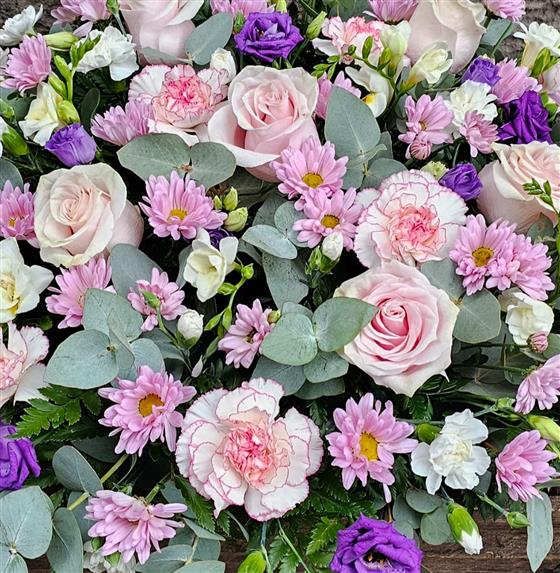 Soft and elegant tribute in shades of blush pink, lilac and white with luxury roses, lisianthus and seasonal flowers.