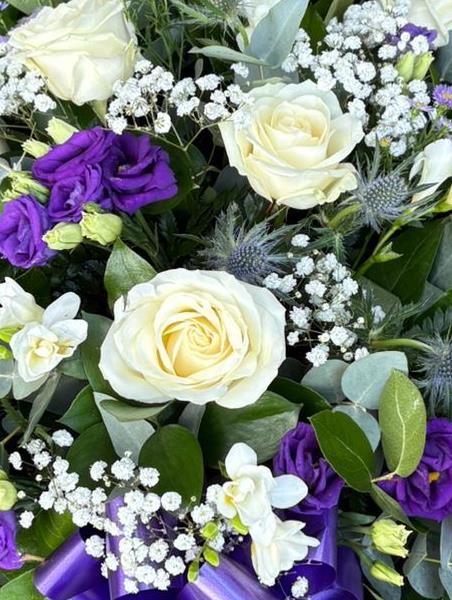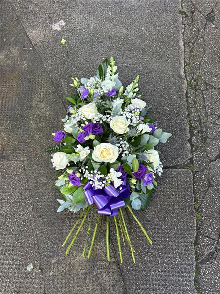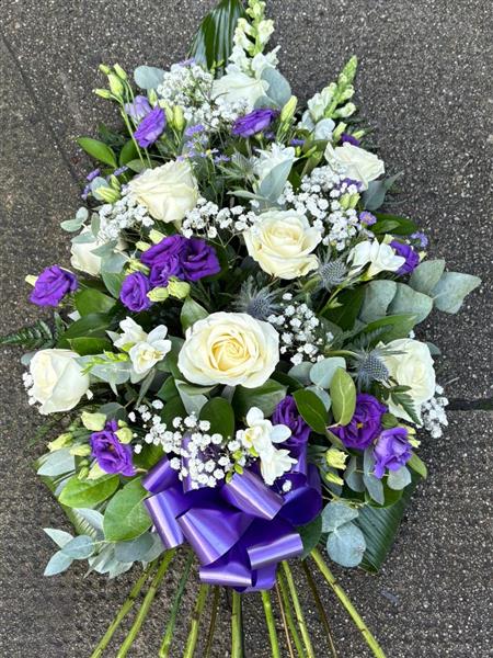 A graceful and timeless floral tribute, the Peaceful Elegance Spray combines white roses, lisianthus, gypsophila, and thistles, beautifully accented with soft greenery and a touch of purple ribbon and blooms.