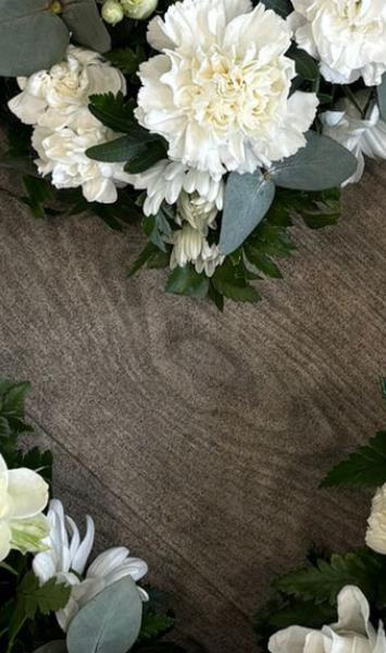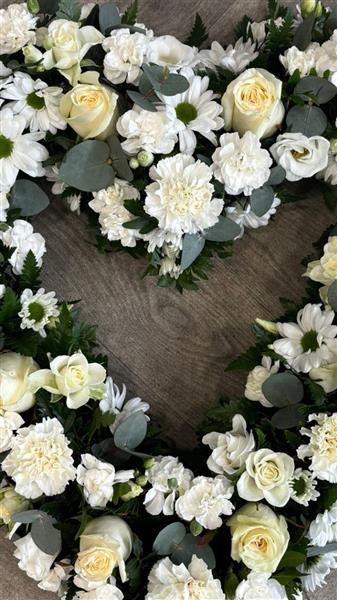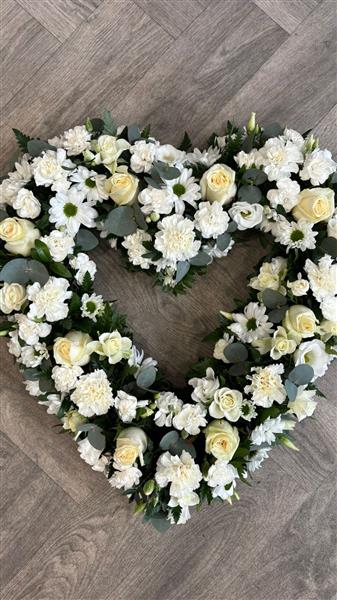 Featuring a delicate mix of white roses, chrysanthemums, carnations and lisianthus, this arrangement is carefully hand-crafted with fresh eucalyptus and seasonal foliage to create a soft, natural finish. The open heart shape represents everlasting love and a bond that never breaks.