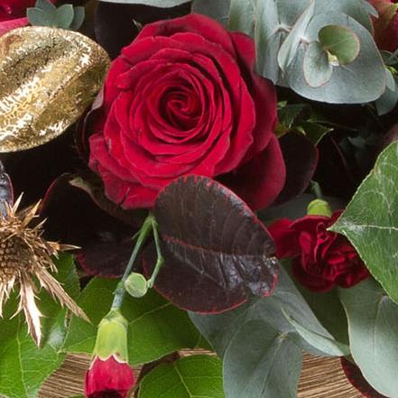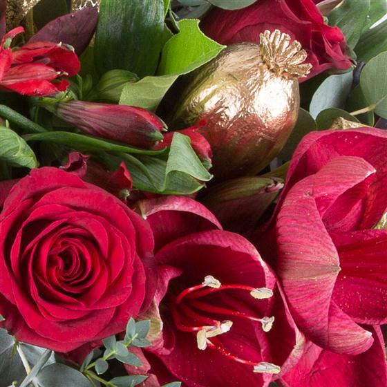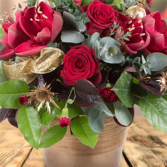 This stunning arrangement exudes elegance and style, making it the perfect choice for an extra special gift. The combination of amaryllis and red roses adds a touch of luxury and sophistication, while the seasonal foliage, cones, and silver clusters infuse a stylish and festive feel.
