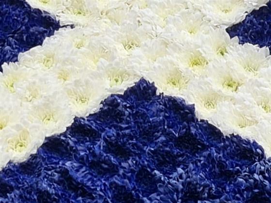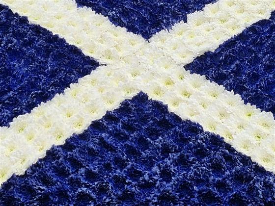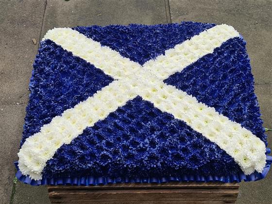 "This striking 2ft x 1.5ft Scotland flag tribute is created with fresh white chrysanthemums, carefully spray-painted to capture the bold blue background and white cross of the Saltire. Perfectly designed to honor Scottish heritage, this beautiful arrangement offers a heartfelt and visually impactful tribute."