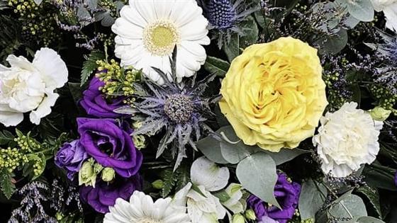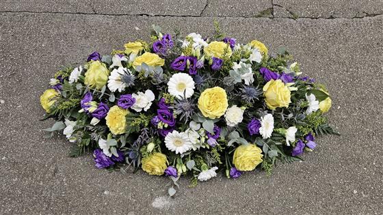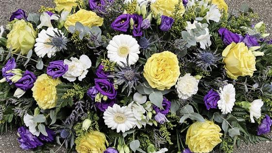 An elegant casket spray in calming tones of lemon yellow, soft white and rich purple. Designed with premium roses, lisianthus, gerbera, thistle, carnations and seasonal foliage to create a beautifully balanced, heartfelt tribute. Thoughtfully arranged with depth, texture and meaning.