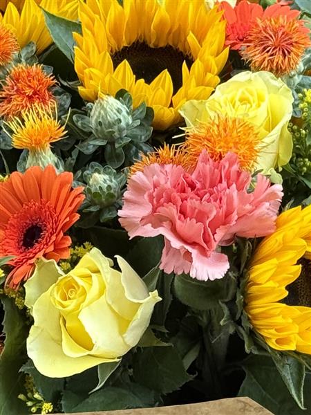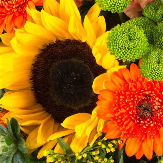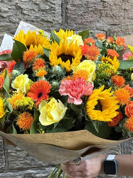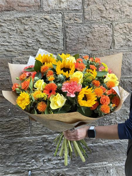 Sunflowers are the focal point of this dazzling, citrus hand-tied bouquet. To avoid disappointment please contact os to confirm sunflower availability.
