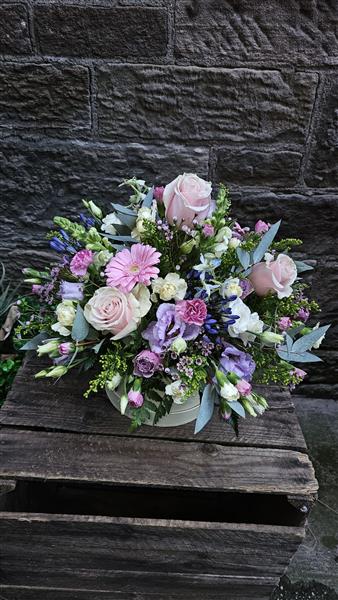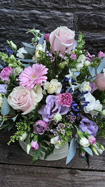 A luxurious mix of soft pink roses, lilac lisianthus, gentle carnations, waxflower, gerberas, agapanthus and seasonal foliage, all beautifully arranged in a reusable hatbox.
