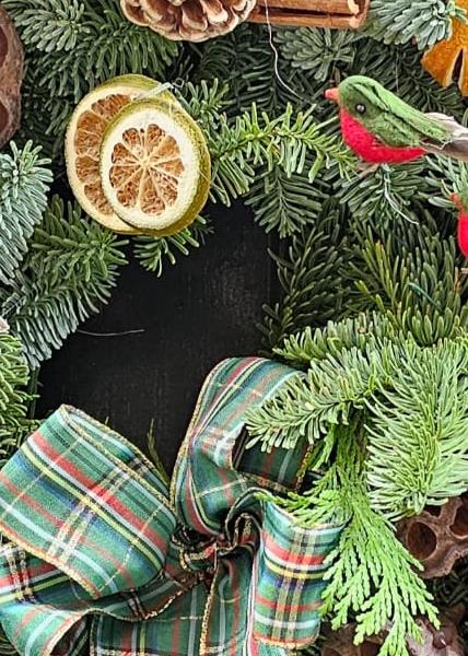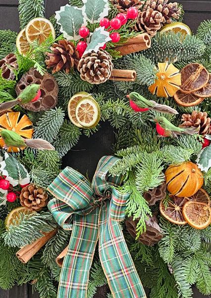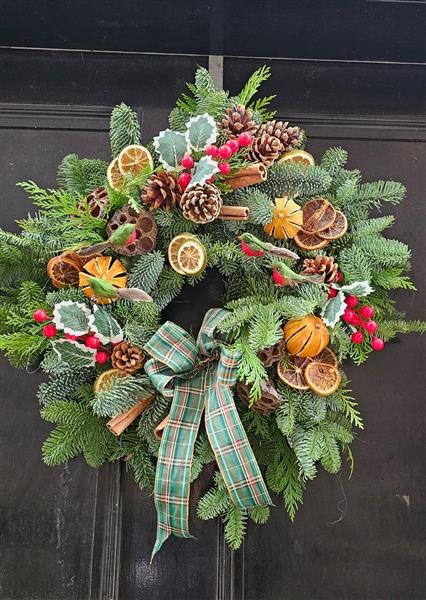 A traditional Scottish-inspired wreath packed with dried oranges, pinecones, berries, cinnamon bundles, lotus pods and decorative festive birds, finished with a rich green tartan bow.