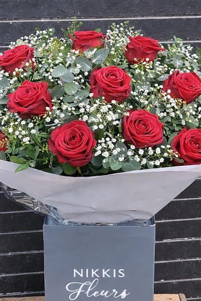 A timeless and elegant arrangement of luxury red roses, beautifully presented in our signature box. Each rose is carefully hand-selected and arranged with soft gypsophila, pistach foliage and touches of structured ruscus, creating a classic yet modern finish.