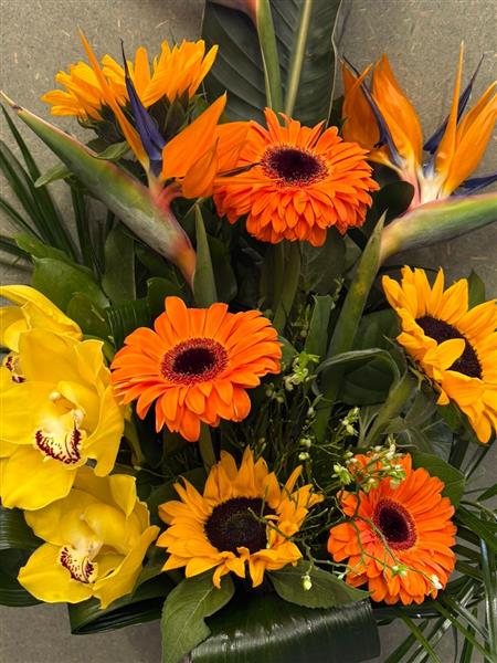 Our Paradise Statement Vase is designed for those who don’t do ordinary. Featuring dramatic Birds of Paradise, vibrant orange gerberas, golden sunflowers, luxury cymbidium orchids and lush tropical foliage, this arrangement is all about impact.