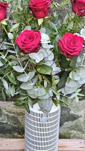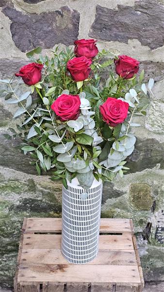 A timeless Valentine’s arrangement featuring six luxury red roses, beautifully arranged with soft eucalyptus and fresh greenery, presented in a modern ceramic vase.