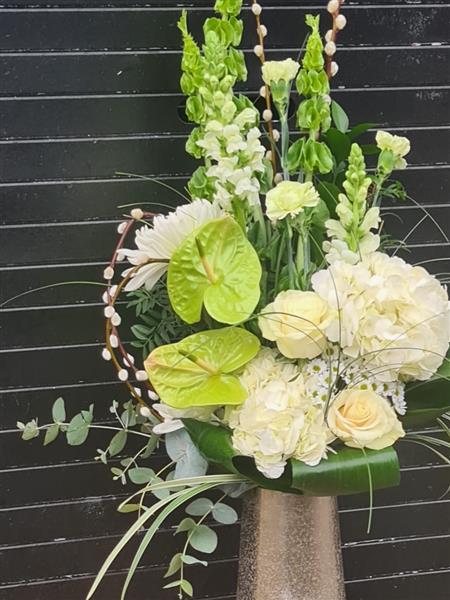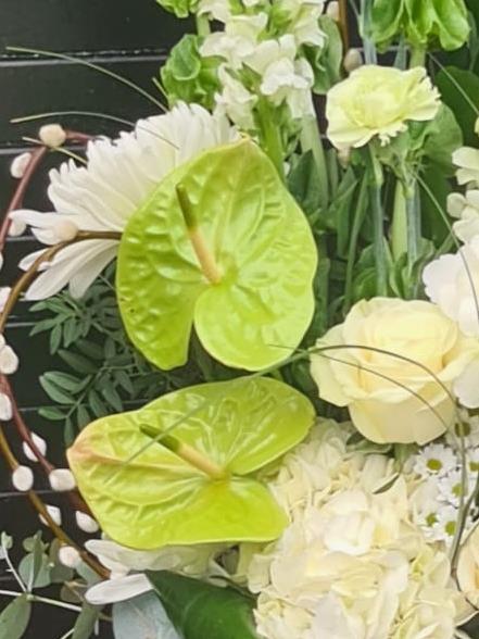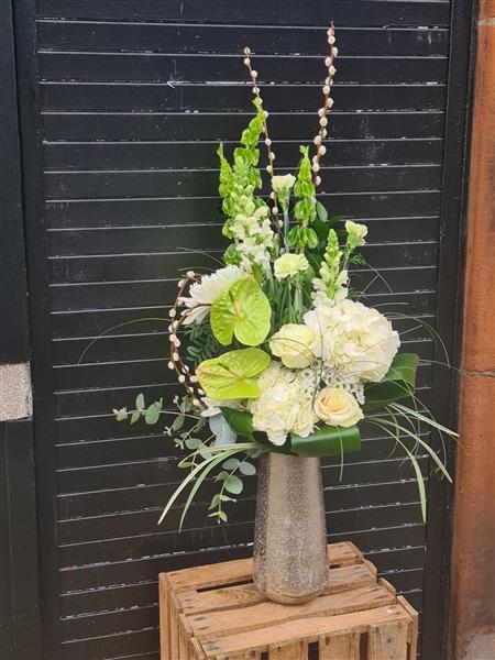 A fresh, contemporary statement piece designed to stand out. Lime Luxe blends crisp whites with vibrant green tones, featuring striking anthuriums, soft hydrangeas, roses, and seasonal textured blooms, finished with natural foliage and sculptural pussy willow for height and movement.