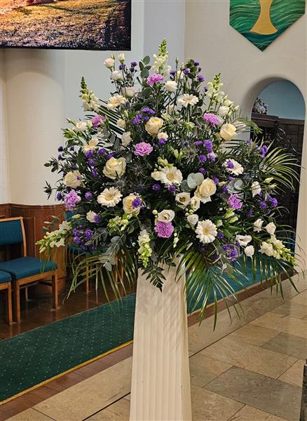 Expertly arranged on a pedestal, it creates a breathtaking focal point for funerals, memorials, church ceremonies or remembrance services.