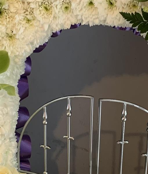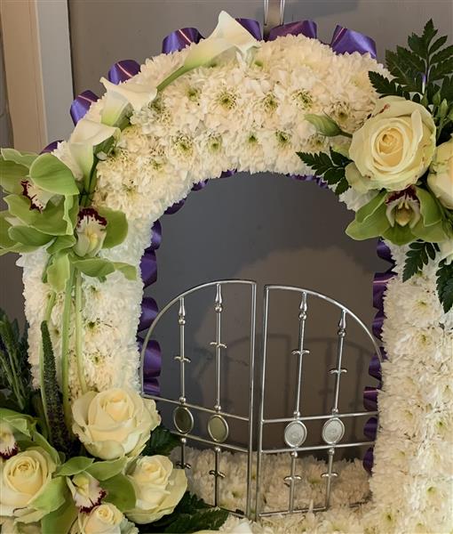 The "Gates of Heaven" is a touching and symbolic tribute that represents a peaceful transition to a better place. This arrangement is thoughtfully crafted with care, featuring a serene design that often includes white flowers, such as roses and Cala lilies, to symbolize purity and hope.